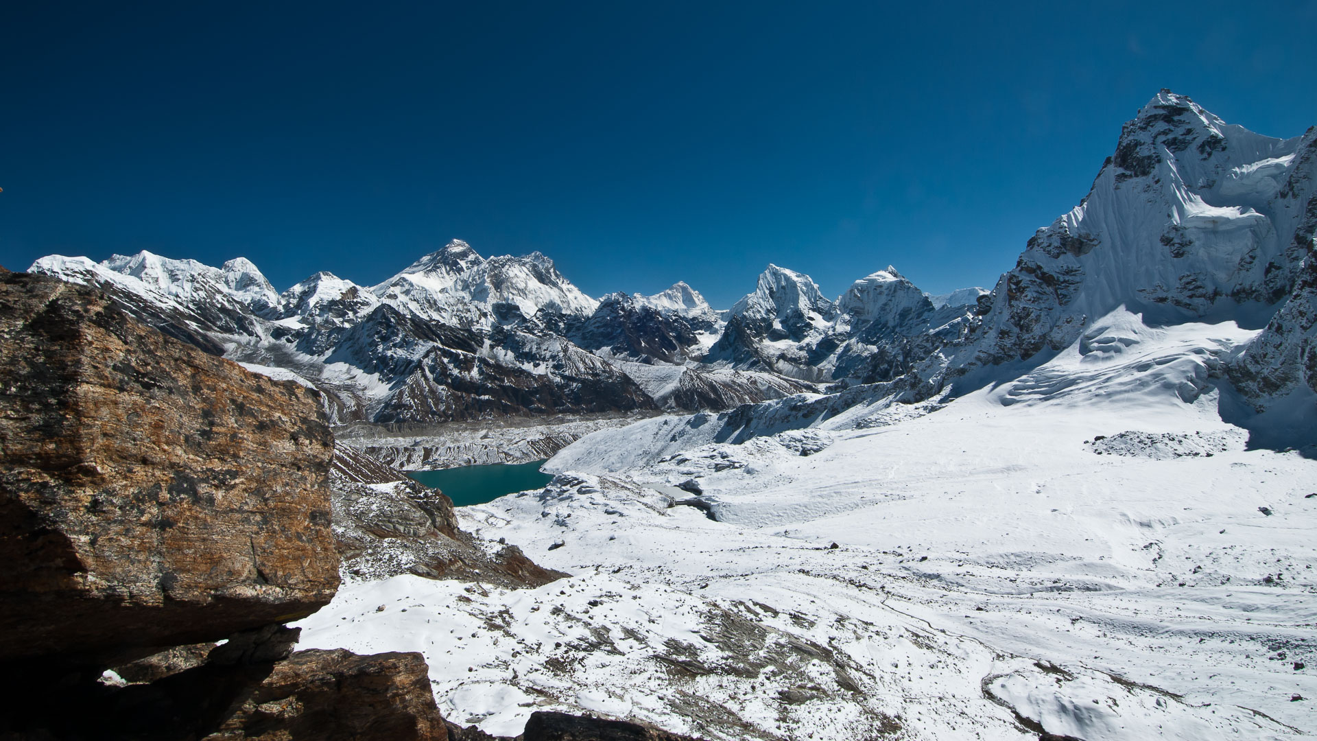 First view from the Renjo La, Nepal: Everest is in the distance and Gokyo Lake far below us.