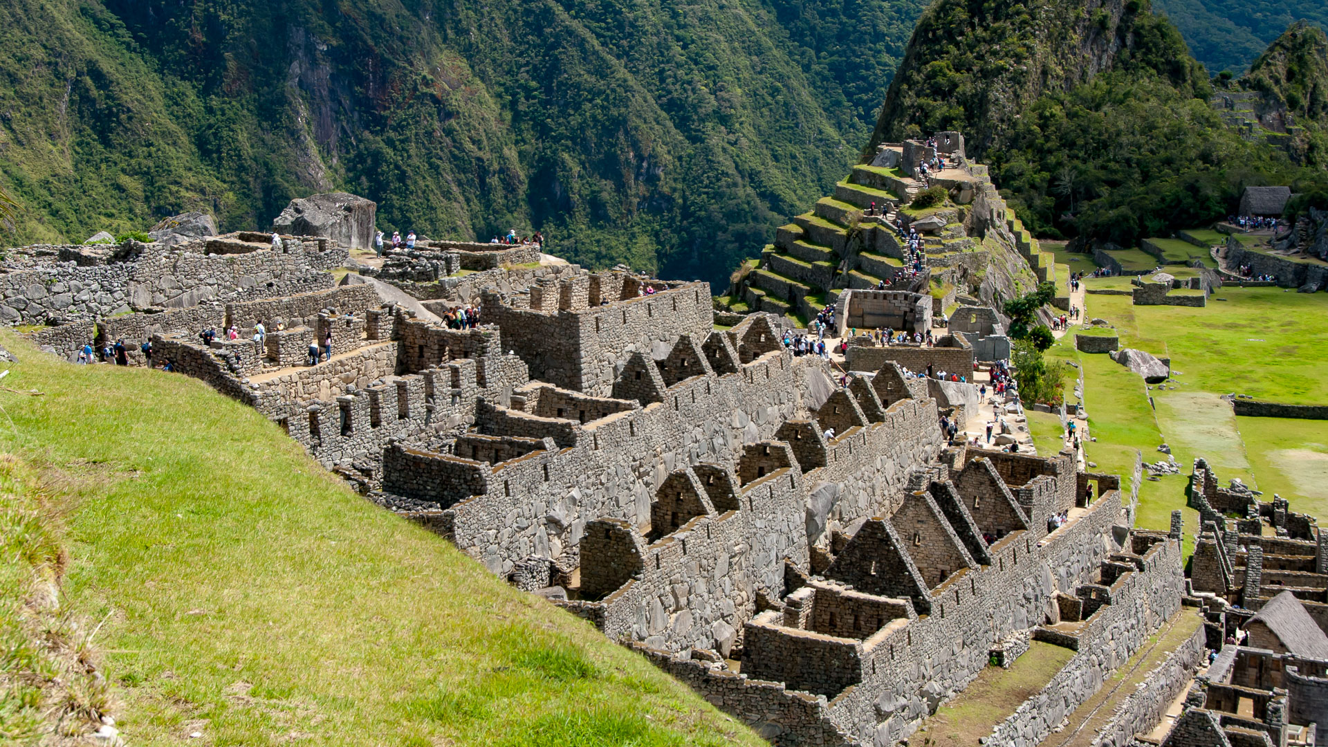 The Royal Sector at Machu Picchu, with the Sacred Plaza, Intihuatana behind it and Huayna Picchu as a backdrop.