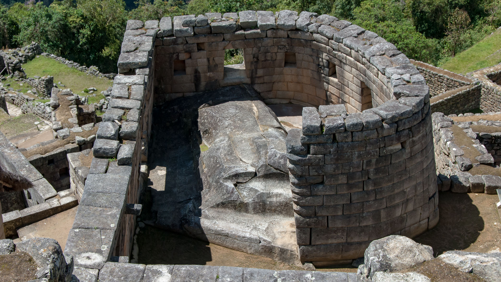 The Temple of the Sun at Machu Picchu, Peru. It is built over a large, polished rock and mimics its shape. Note the trapezoidal shape of the alcoves and windows – a common Inca feature. One of the windows is aligned to sunrise on the summer and winter solstices.