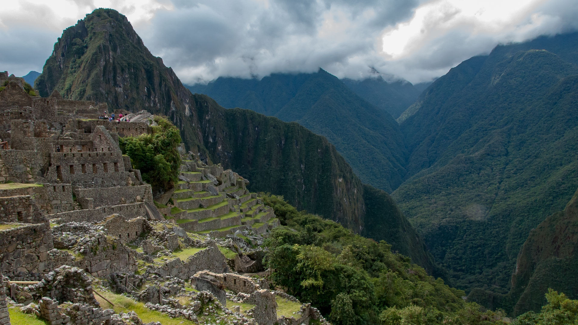Terraces on the west side of Machu Picchu, Peru. The break in the forest on the mountain in the distance is part of the original Inca Trail.