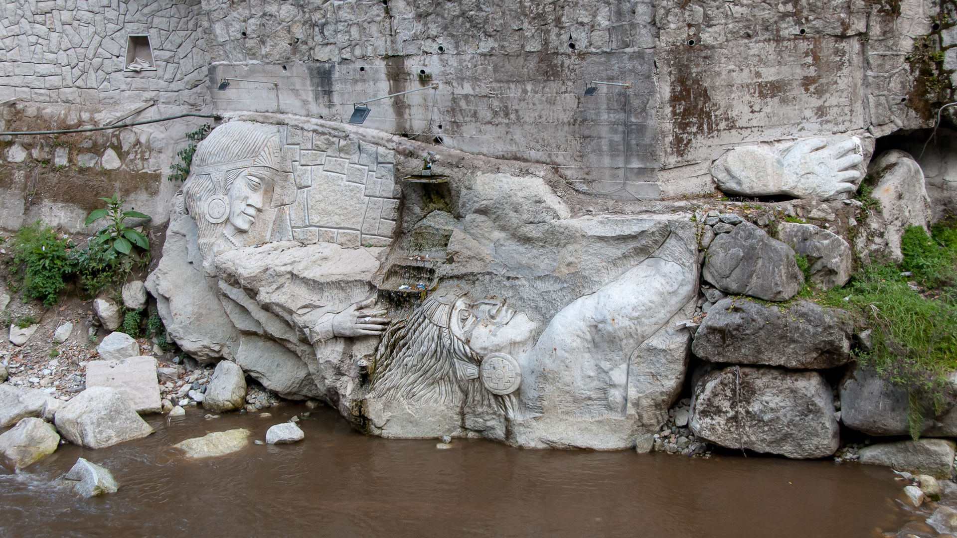 Art work in the Inca style along the Urubamba River in Aquas Caliente, Peru