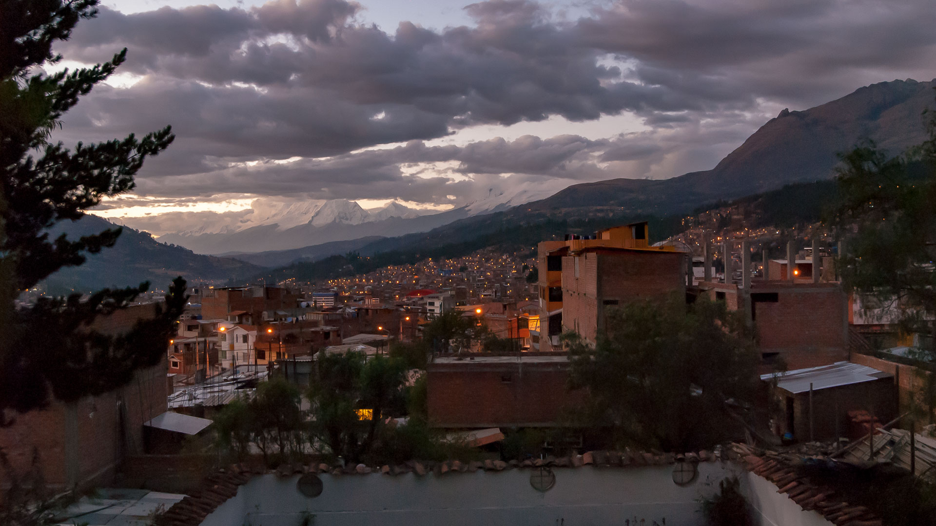 Huaraz, Peru at dusk. The high peaks in the distance are in Huascarán National Park. Quite the view from my hotel room.
