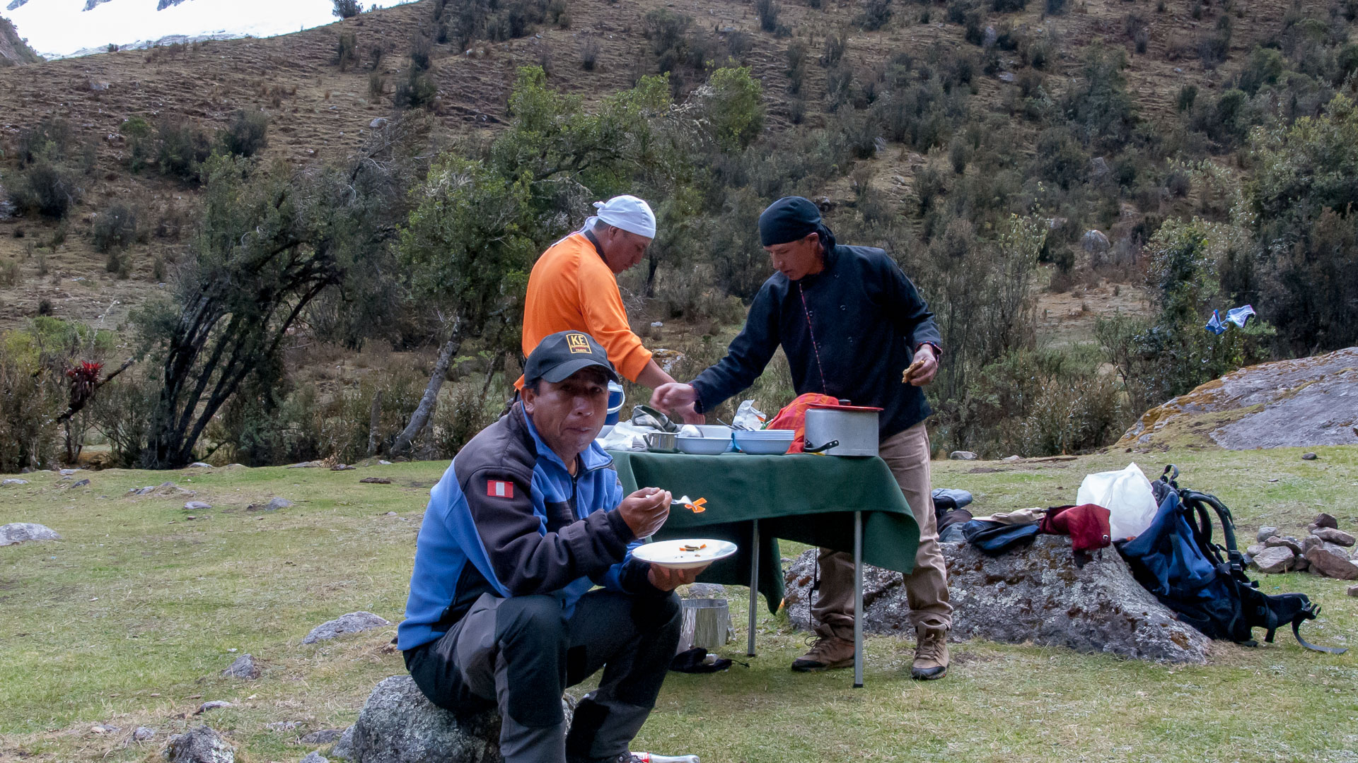 First lunch on the trek. Tuctu valley, Peru. Our cook and assistant cook were always waiting for us each day on the trek with a smile, a hot cup of tea and a delicious lunch.